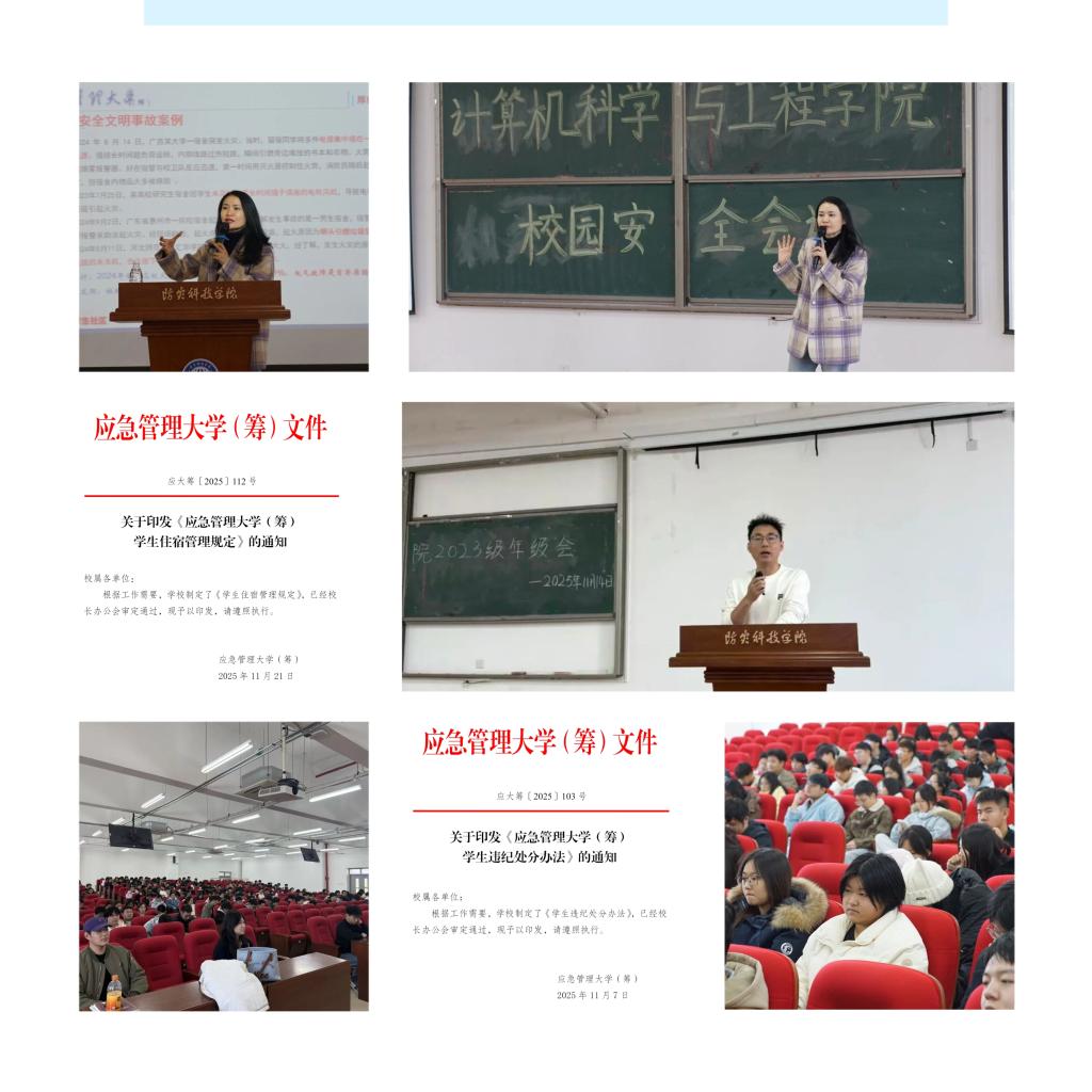 以“宿舍文明活动月”为契机,学院围绕“安全、文明、有序”目标,将“宿舍文明活动月”与学风建设深度绑定。为推动学生自觉规范生活、端正学习态度,学院在活动月期间建立常态化公示机制,每周持续发布宿舍卫生情况公示与晚自习考勤公示推文,以公开反馈的方式,引导学生养成良好作息与整洁习惯,实现宿舍生活风尚与学风氛围的双向促进;11月21日,召开校园安全会议,细化宿舍违规电器禁用、水电规范、内务整洁等安全与管理要求,明确网络安全、制度落实等重点,以制度约束与正向引导结合,筑牢宿舍文明与安全底线。